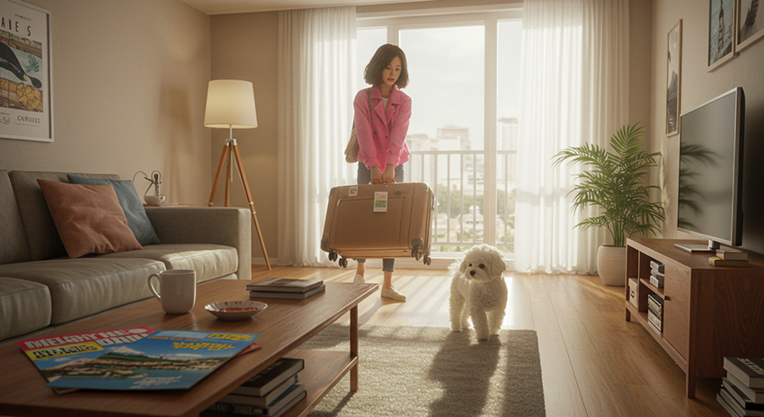 외출 중 반려동물이 안전하게 머무를 수 있도록 실내 환경을 사전에 점검하는 것이 가장 중요합니다.